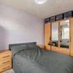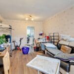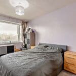 The interior of this property, situated on the first floor of the building, comprises a spacious living room, fitted kitchen, two double bedrooms, and a family bathroom.