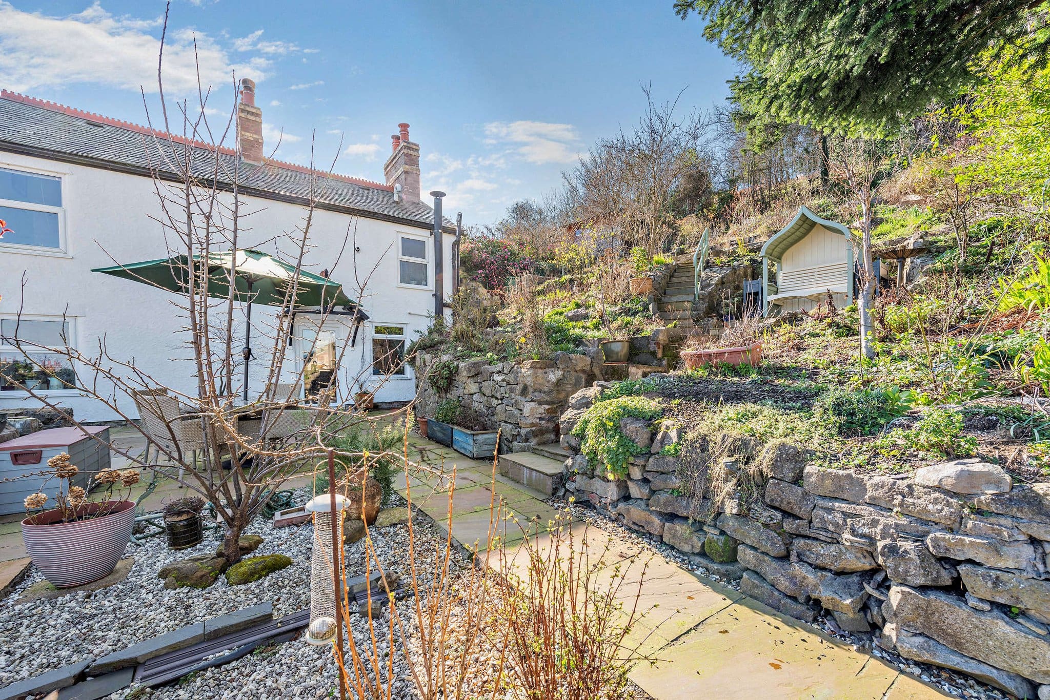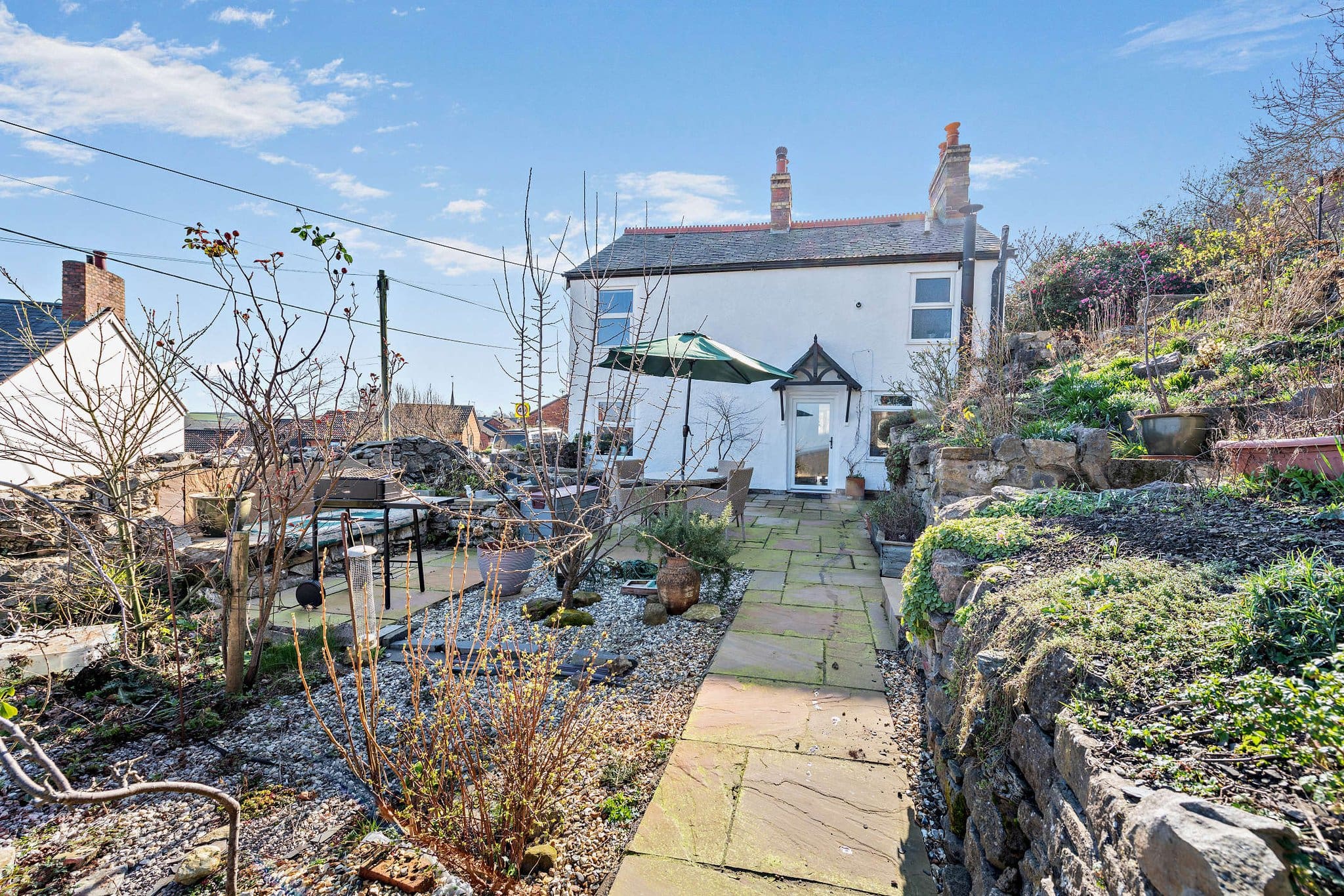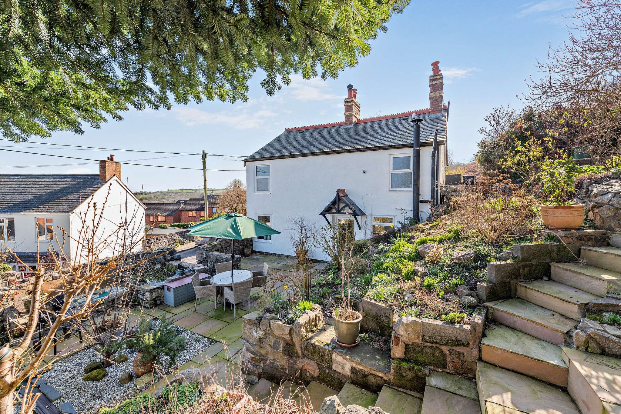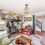 The interior of this charming character property comprises a stylish kitchen with fitted units, solid worktops and a traditional Aga, flowing into a spacious dining and sitting area with a log-burning stove and access to the garden. A further cosy lounge with exposed stonework and feature fireplace completes the ground-floor living accommodation. The first floor consists of three bedrooms, including two well-proportioned double bedrooms enjoying far-reaching views, alongside a beautifully appointed family bathroom featuring a freestanding bath and large walk-in shower. The exterior boasts a series of landscaped patio terraces, providing multiple seating and entertaining areas perfect for enjoying the summer months. The garden also includes a summer house and elevated viewpoints that make the most of the impressive surrounding views.