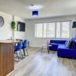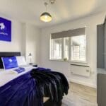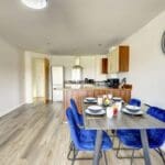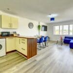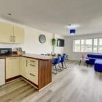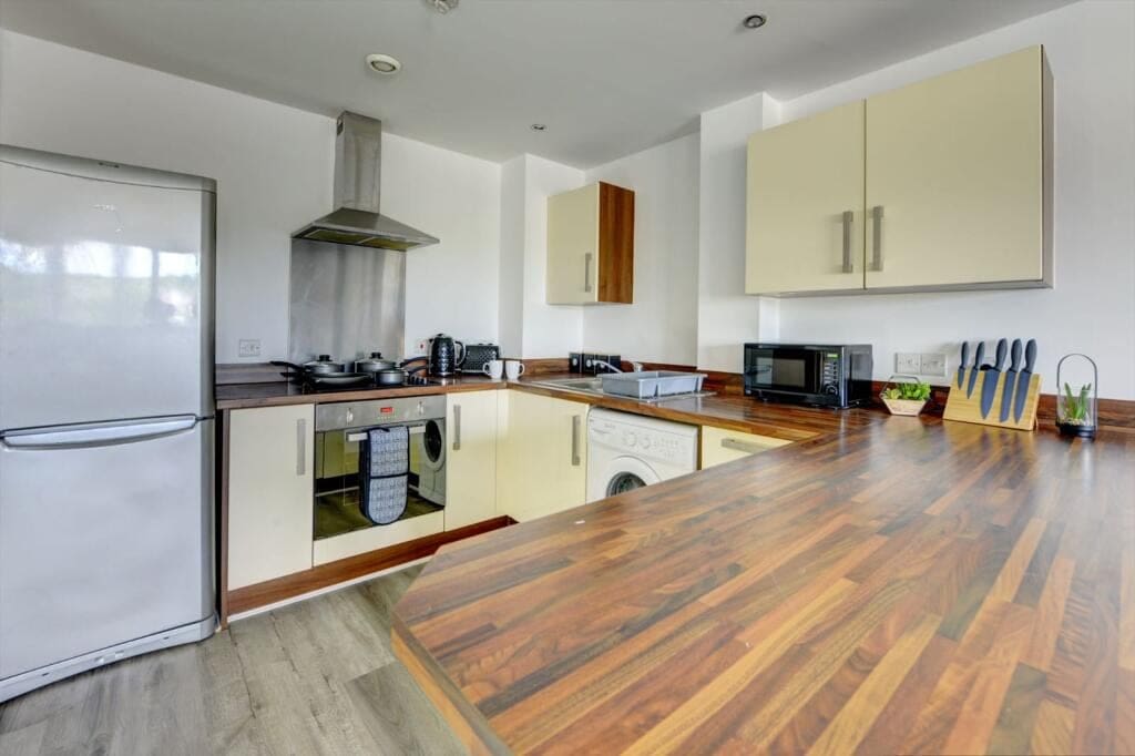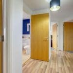 The interior of this beautifully presented, fifth floor property comprises a spacious open-plan living/dining/kitchen area, two good sized bedrooms, and a family bathroom.