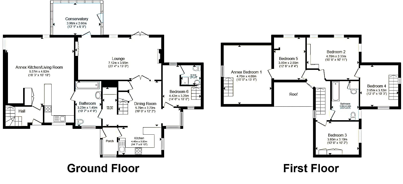 The main house: spacious lounge, conservatory, kitchen/diner with utility room and bedroom, with an en-suite on the ground floor. The first floor consists of three generously sized bedrooms and a second bathroom.