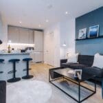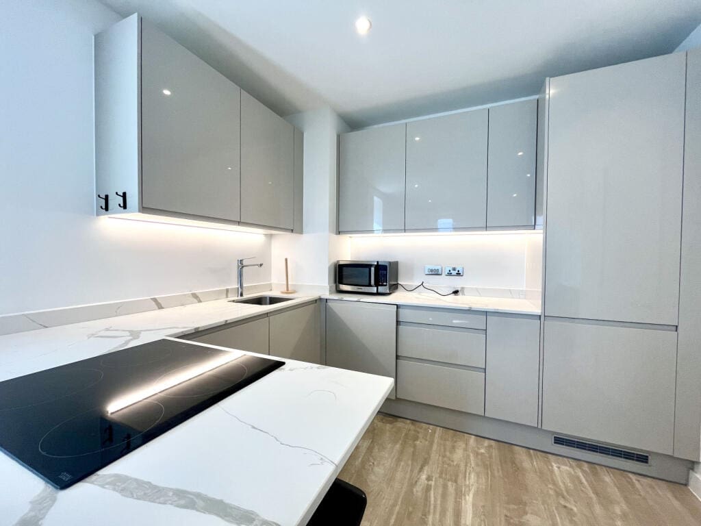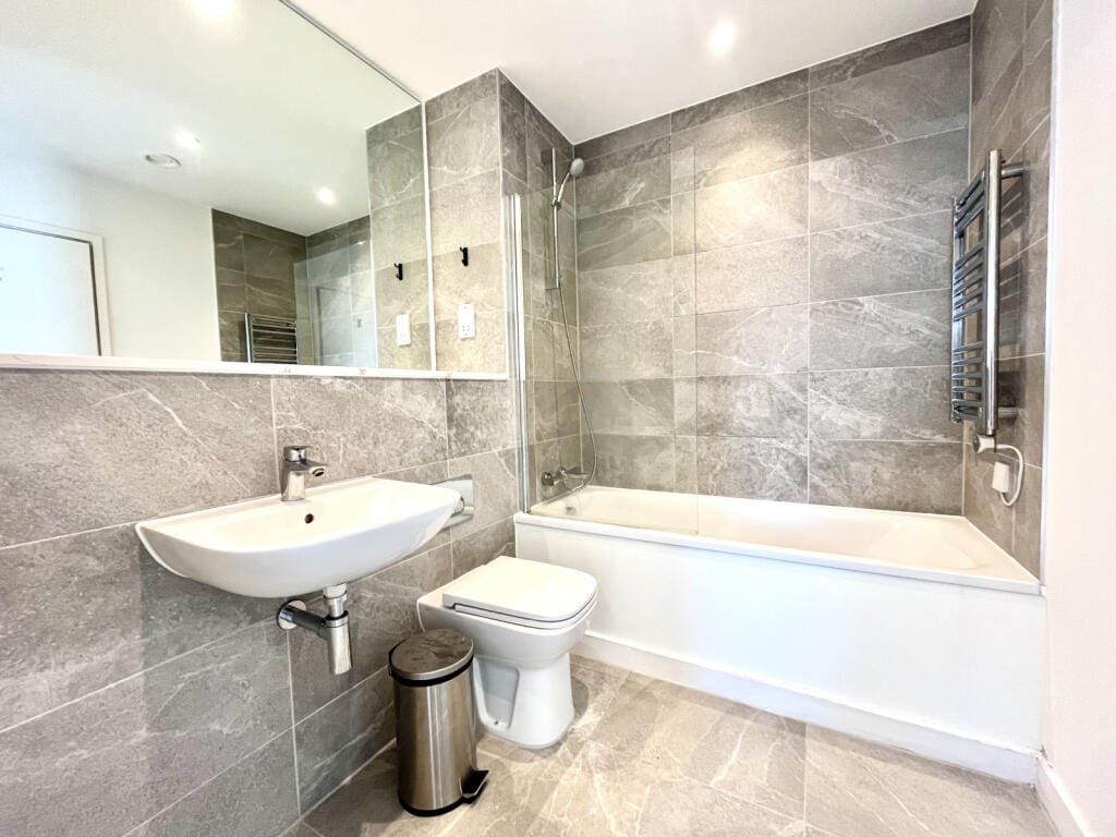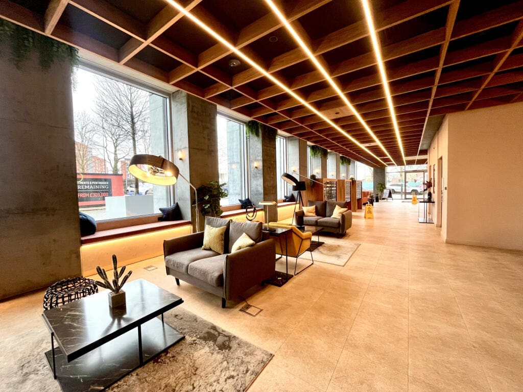 The interior of this beautifully presented, twelfth floor property comprises a spacious, open plan living/kitchen area, and utility room, with the two double bedrooms, and a family bathroom located upstairs. The property also boasts 24/7 concierge, residents gym and yoga studio, cinema room, and sky terrace, perfect for enjoying the summer months.