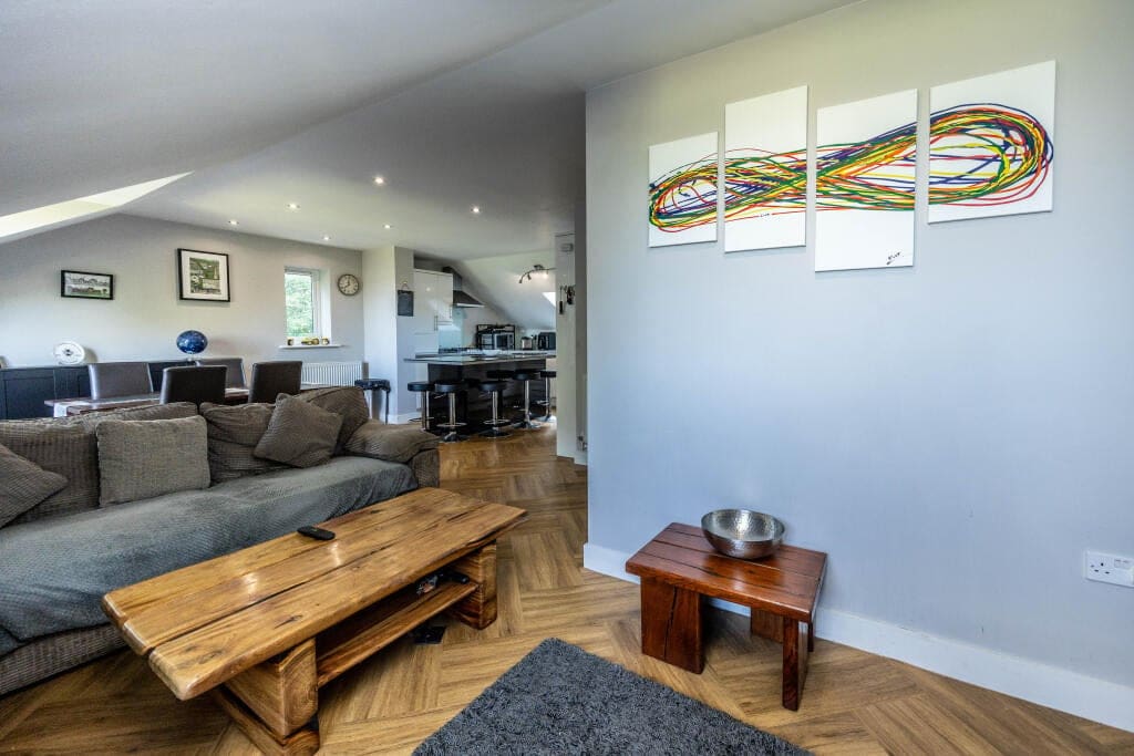 This impressive property offers a bright and spacious interior, featuring a generous living room and a large, contemporary kitchen/diner. The home comprises two well-proportioned double bedrooms, including a principal bedroom with its own stylish en-suite, along with a sleek family bathroom. Adding to its appeal, the property boasts two private balconies, both offering stunning views of the surrounding countryside.