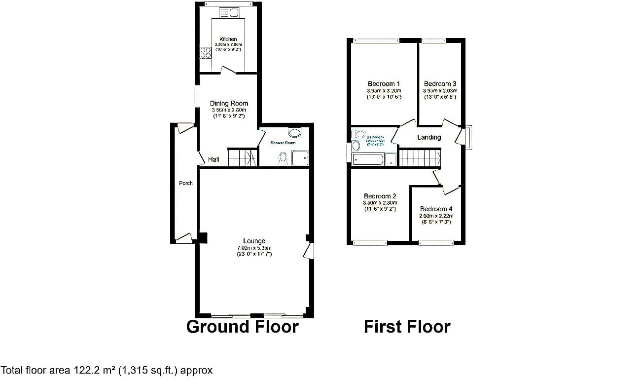 The interior of this property, which may require modernisation throughout, comprises a spacious living room, dining room, fitted kitchen, and shower room on the ground floor. The first floor consists of four generously sized bedrooms, alongside the family bathroom. The exterior boasts a private rear garden, with both patio and lawn areas, perfect for enjoying the summer months.